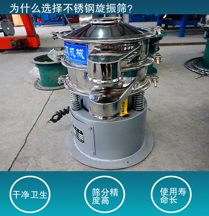 不銹鋼旋振篩采用的是不銹鋼材質,經過拋光之后,不僅無黑點,無毛刺,不會有料渣殘余,非常的好清理;并且符合衛生生產標準,能達到生產要求。