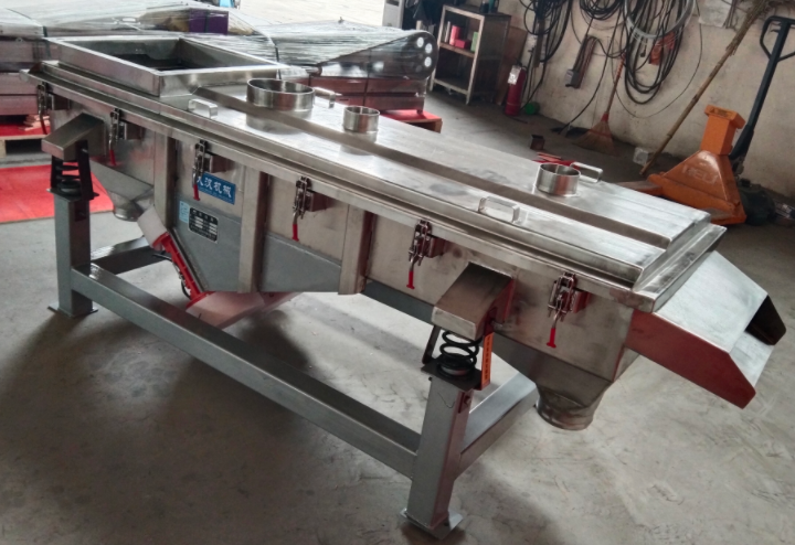 這是用來篩精細(xì)物料的主要設(shè)備,靠立式的振動(dòng)電機(jī)帶動(dòng),電機(jī)上下兩端的偏心塊會(huì)產(chǎn)生一種復(fù)合力量,讓篩網(wǎng)同時(shí)做水平、垂直和傾斜三個(gè)方向的運(yùn)動(dòng)。