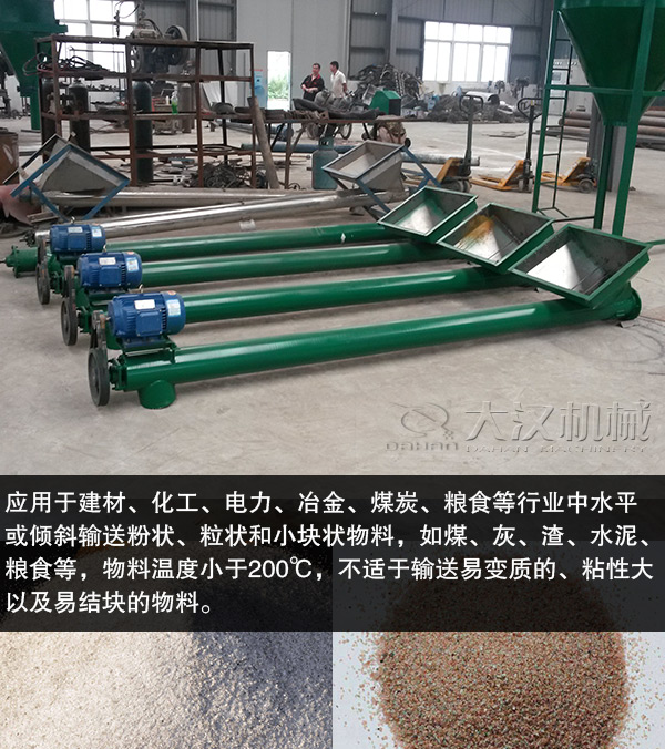 螺旋輸送機廣泛應用于建材、化工、電力、冶金、煤炭、糧食等行業中水平或傾斜輸送粉狀、粒狀和小塊狀物料,如煤、灰、渣、水泥、糧食等,物料溫度小于200℃,不適于輸送易變質的、粘性大以及易結塊的物料。
